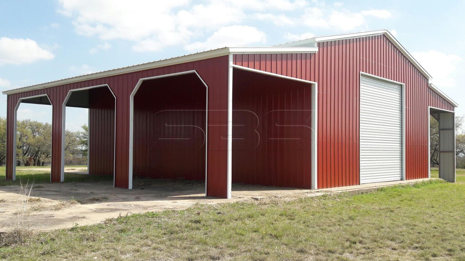 42' wide x 36' long Vertical Roof Barn with 2- 12x36 lean to's.. One lean too has one side and 2 ends closed.. middle section and the other lean to is open