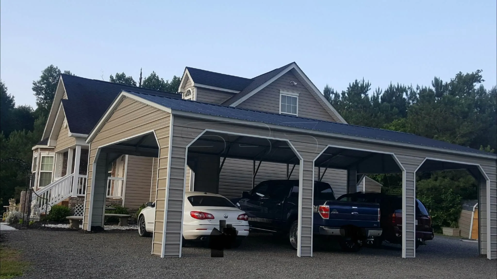 The 24'x36' metal pavilion carport is a spacious and versatile structure designed to accommodate up to three cars while providing shelter and protection from the elements. With dimensions measuring 24 feet in width and 36 feet in length, this carport offers an expansive and adaptable covered area suitable for multiple vehicles or a combination of vehicles and outdoor storage.